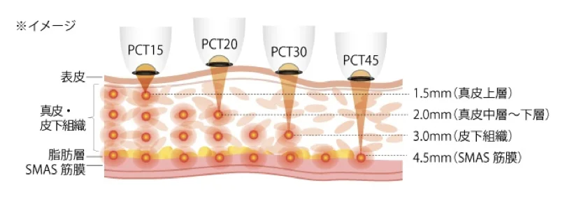 皮下のターゲットとする深さに対し、集束した超音波を高速照射することで、表皮にダメージを与えることなく強い熱を与えて、組織を熱凝固させ皮膚を内側から引き締めます。