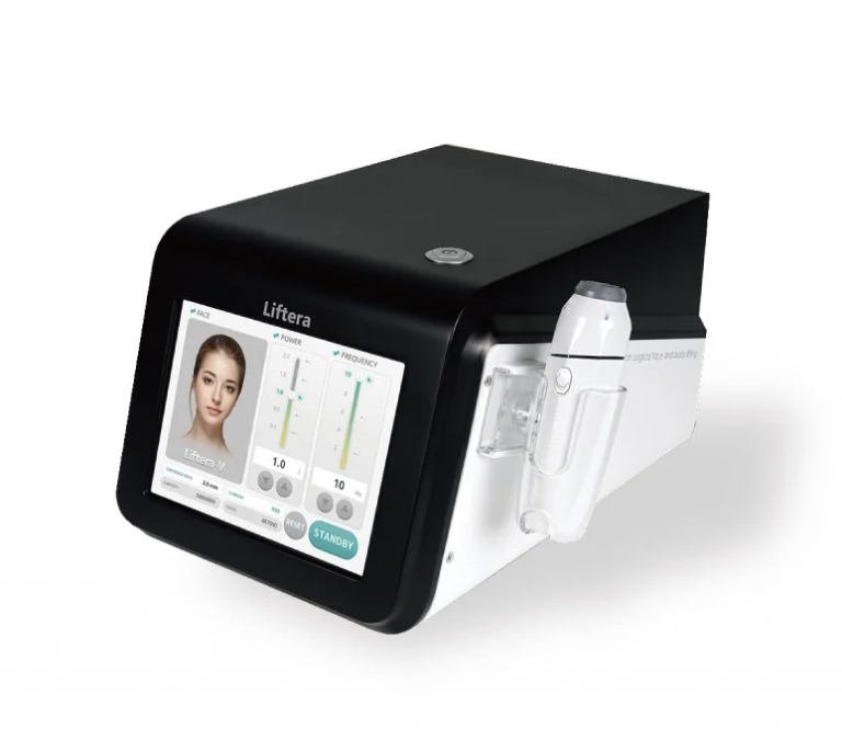 リフテラVはハイフ(HIFU・高密度型焦点式超音波)を応用した、最新のフェイスリフティング&タイトニング機器です。 アプリケーターを動かしながらHIFUを照射することで痛みを抑え、顔全体の土台となるSMAS筋膜、皮下組織、真皮の3層を熱凝固の作用により引き締めることで、たるみやハリ感を皮膚の内側から改善させます。